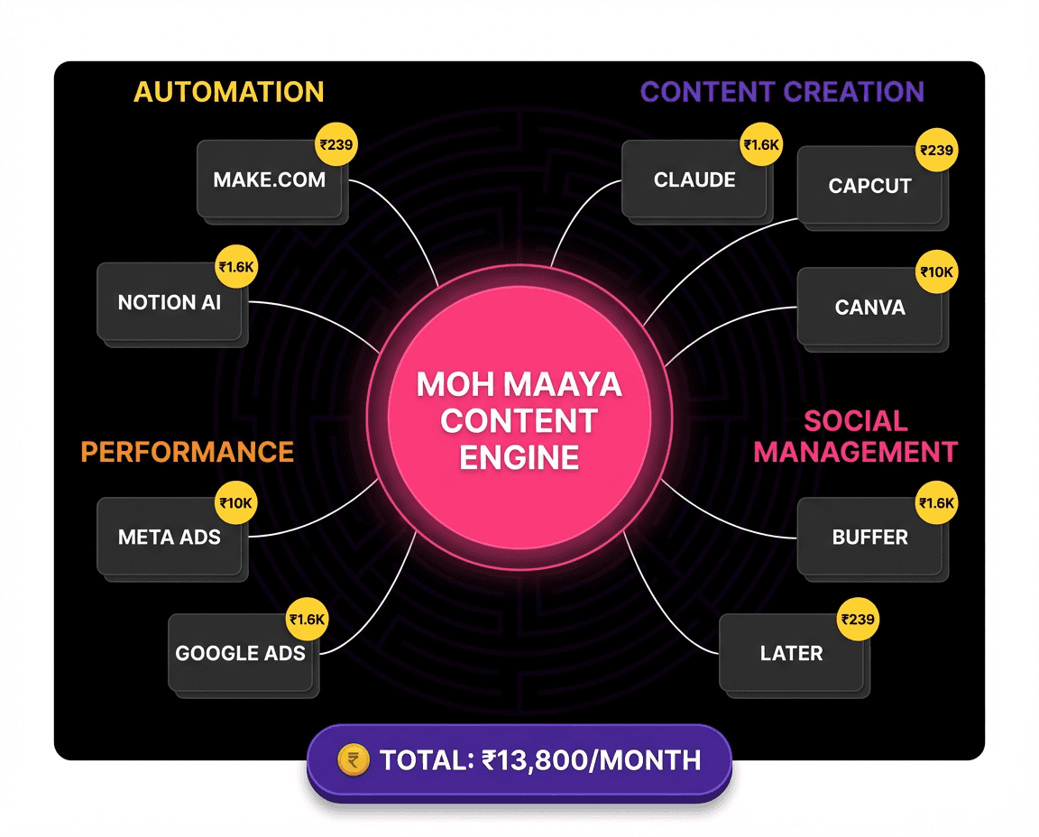 A transparent breakdown of the AI powered marketing stack we actually use at Moh Maaya Media, including tools, workflows, costs, and where human strategy still matters most.